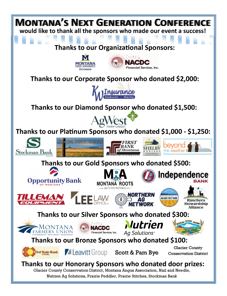If you have any questions, please Kari Lewis at (406) 873-2239 or kari.lewis@montana.edu. We thank you for helping us bring this outstanding set of speakers to our area and look forward to partnering with you to keep Montana agriculture strong in the coming years!